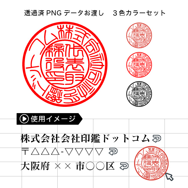 透過PNG画像、実寸18mm・朱・赤・黒3色セットの電子印鑑です。日常的な書類作成時の会社印としてお使いいただけます。