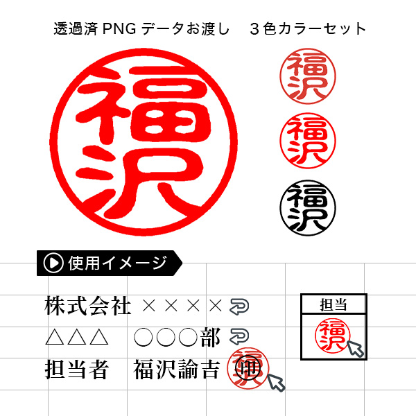 透過PNG画像、実寸12mm・朱・赤・黒3色セットの電子印鑑です。日常的な書類作成時の担当印などにお使いいただけます。