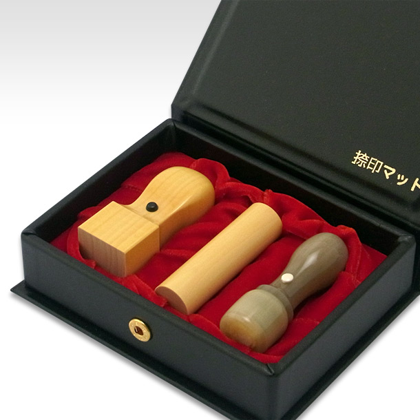 起業・開業・会社設立に欠かせない銀行印・実印の3本に「専用ケース(捺印マット機能付)」がセットになっています。