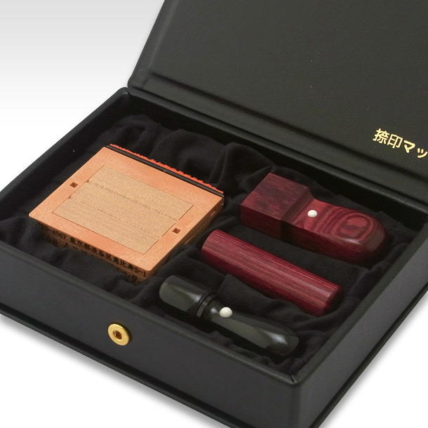 起業・開業・会社設立に欠かせない実印・銀行印の3本と、開業後に必要となる住所印(分割式ゴム印)がセットになっています。「専用ケース(捺印マット機能付)」がセットになっています。