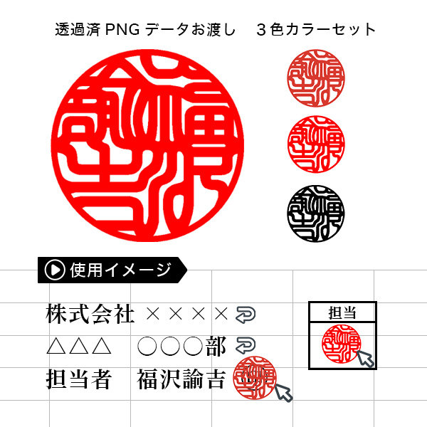 透過PNG画像、実寸15mm・朱・赤・黒3色セットの電子印鑑です。日常的な書類作成時の担当印や案内文書などにお使いいただけます。