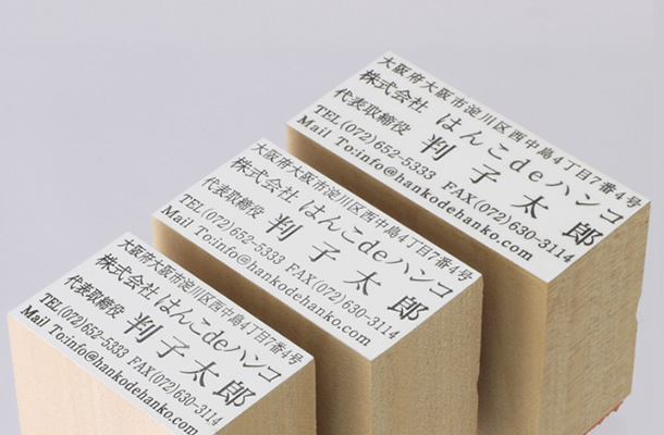 大型の住所印用ゴム印です。住所や会社名、代表者や個人名、電話番号等をお入れすることが多いですが、最近では携帯電話やメールアドレス、ホームページのURLやフェイスブック、ツイッターのアカウント等を入れる方も。
